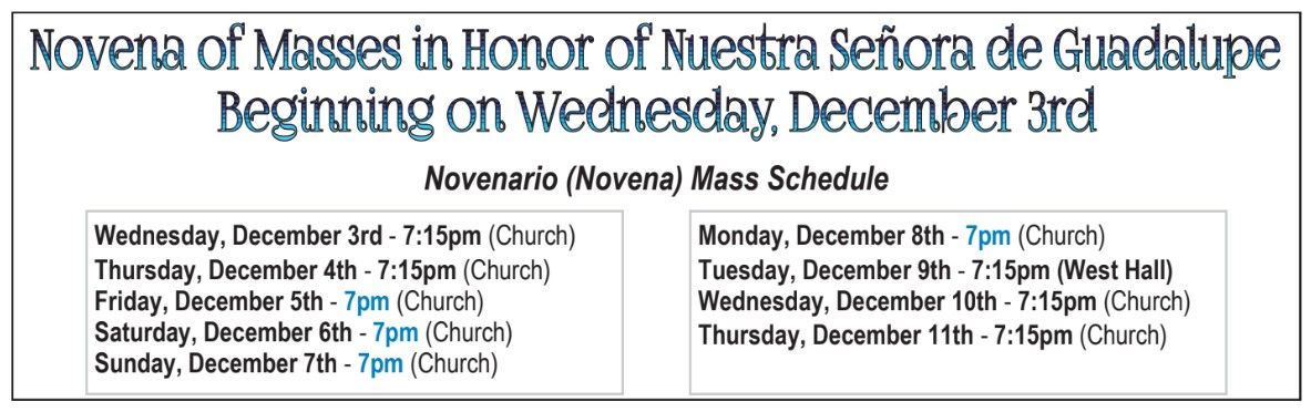 Each evening the Novena Mass will begin at 7:00 or 7:15 pm in the church, except for December 9 when we will gather in the Parish Center’s West Hall at the same time. Please see below for specific Mass times.